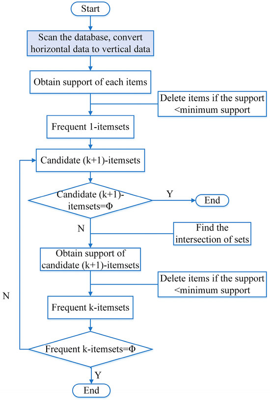 Éclat is a classical algorithm for searching frequent itemsets in vertical data formats [38]. The core idea of the Éclat algorithm is to divide the search space into smaller subspaces using prefix-based equivalence relations, and each subspace is searched independently using a bottom-up search method to generate frequent item sets. The flowchart is illustrated in Figure 2.