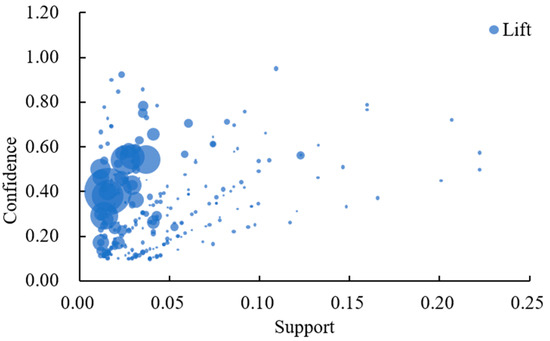 Support of represents the probability that the data set contains both X and Y [39]. Confidence is used to measure the probability of X occurring if Y occurs, i.e., the conditional probability. A rule is considered strongly associated if it is greater than or equal to the minimum support and minimum confidence [40]. Lift considers the probability of Y changing when X occurs to characterize the degree of association between the LHS and RHS, which could avoid the interference of pseudo-strong association rules and prevent invalid association rules appearing in the final result. A rule is regarded as a valid strong association rule when the lift value is greater than 1 [41]. These three thresholds are manually set according to the needs of data mining [42,43].