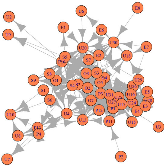 It can be seen that the nodes with high in-degree values include failure to determine the risk (U31), failure to take effective collision avoidance action early (U25), and failure to make proper sound and light signals (U16), which are significantly influenced by adjacent nodes and may lead to serious consequences. In particular, failure to determine the risk (U31) has the largest in-degree with a value of 22, but the out-degree value is only 5, indicating that there are 22 seafarers’ unsafe acts and their influencing factors in the interaction network that can lead to seafarers’ failure to determine the risk. On the other hand, the nodes with high out-degree values include lack of supervision and guidance (S2), inadequate safety management (S4), and lack of standardization (O7), which have a higher direct impact on adjacent nodes. The nodes with the highest total degree values are failure to determine the risk (U31) and lack of supervision and guidance (S2) with a degree value of 27, followed by inadequate safety management (S4) and failure to maintain proper lookout (U17). These nodes with high total degree values are key nodes in the interaction network, and taking proactive prevention of these influencing factors and seafarers’ unsafe acts would effectively reduce the connectivity of the network. In addition, the average degree value of the network is 9.81, which indicates that each seafarers’ unsafe act/influencing factor in the network is closely related to 9.81 other seafarers’ unsafe acts/influencing factors on average, i.e., changes in each node in the interaction network would cause changes in an average of 9.81 nodes that have a direct effect relationship with that node.