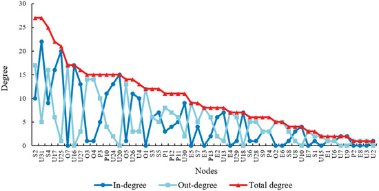 The degree of a node in a complex network is one of the most important and fundamental features for analyzing the network topology. In the developed interaction network of seafarers’ unsafe acts and their influencing factors, the degree of a node is the number of seafarers’ unsafe acts and their influencing factors that directly connected to other seafarers’ unsafe acts and their influencing factors. The degree of a node reflects the direct influence of the node in the network, the more connections a node has, the greater the influence of that node in the network. The in-degree, out-degree, and total degree values of the nodes in the interaction network of seafarers’ unsafe acts and their influencing factors are shown in Figure 6.