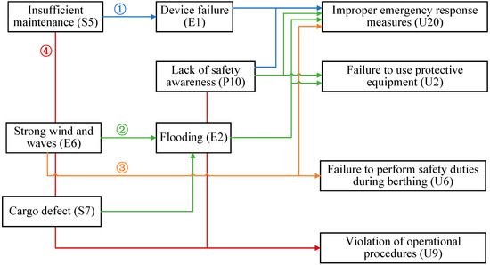 Community 1 includes 10 nodes of insufficient maintenance (S5), cargo defect (S7), lack of safety awareness (P10), device failure (E1), flooding (E2), strong wind and waves (E6), failure to use protective equipment (U2), failure to perform safety duties during berthing (U6), violation of operational procedures (U9), and improper emergency response measures (U20). The community involves four typical risk propagation paths of seafarers’ unsafe acts, as shown in Figure 11. The colored arrows refer to typical risk propagation paths. (1) Due to improper daily inspection and maintenance of the ship, sudden failure of device (rudder, main engine, etc.) during navigation operations, as well as poor safety awareness of the seafarers, etc., resulting in untimely and inappropriate emergency response measures, which eventually lead to ship accidents; (2) Under the effect of strong wind and waves, as well as ship’s being empty, fully loaded, overloaded and improperly cargo loaded. The ship deck is on the waves, and water enters inside the cabin, due to the seafarers’ poor safety awareness and other reasons. The seafarer goes to the main deck for side cabin operation without using safety ropes, wearing life jackets and other appropriate protective measures, and the emergency response measures are improper, which eventually have a greater possibility of leading to the personnel falling into the water and ship sinking accidents; (3) When the ship moored at berth, under the effect of strong wind and waves, the ship position is uncontrolled and may be dragging anchor, meanwhile, the seafarers do not fully perform the safety duties of berthing watch and make routine inspection of the ship, the seafarers fail to discover the current danger in time and do not take any emergency measures which may eventually lead to ship accidents; (4) Due to improper daily inspection and maintenance of the ship, as well as the weak safety awareness of the seafarers, the seafarers violate the operation procedures when carrying out fire operation, which tends to cause fire and explosion accidents.
