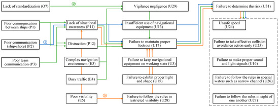 Community 2 includes 21 nodes such as lack of standardization (O7), complex navigation environment (E3), busy traffic (E4), poor visibility (E5). The community involves the largest number of nodes, mainly including three risk propagation paths of seafarers’ unsafe acts, and has typical collision accident characteristics, as shown in Figure 12. The colored arrows refer to typical risk propagation paths. (1) When there are potential risks in the current environment, the relevant shore-based maritime authorities do not provide timely and accurate navigational guidance and poor ship-shore communication, resulting in the loss of seafarers’ situational awareness, meanwhile seafarers fail to make full use of navigational aids and maintain a proper lookout, thus failing to make a full evaluation of the current dangerous situation, thus causing the subsequent series of seafarers’ unsafe acts (U24, U25, U26, U27); (2) Due to the irregularity of the company’s operation rules and regulations, the seafarers do not keep the vigilance required by the special situation in the complex navigation environment or the busy traffic, and fail to establish effective cooperation and communication between ships and within the bridge team, which cause the seafarers to lose situational awareness of the current environment, distracts their attention, and failure to keep a regular lookout, thus, leading to the subsequent series of seafarers’ unsafe acts (U31, U24, U25, U26, U27); (3) The seafarers do not keep the AIS and other navigational aids in working condition, and do not follow the safety rules in restricted visibility, as well as the seafarers lose their situational awareness and do not maintain a proper lookout, so that they fail to make a full evaluation of the current dangerous situation, which leads to a subsequent series of seafarers’ unsafe acts (U16, U24, U25, U26).