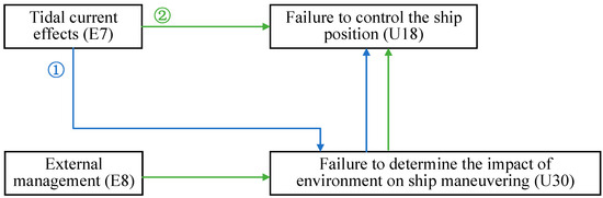 Community 3 includes 4 nodes of tidal current effects (E7), external management (E8), failure to control the ship position (U18), and failure to determine the impact of environment on ship maneuvering (U30). The community involves two risk propagation paths of seafarers’ unsafe acts, and has typical contact accident characteristics, as shown in Figure 13. The colored arrows refer to typical risk propagation paths. (1) The current water is in high tide/low tide situation, the seafarers fail to fully evaluate the effect of current environment on ship maneuvering, and fail to control the ship’s position during the process of leaving berth, resulting in ship contact accidents; (2) Due to the defects in the management of external organizations such as wharf companies, the seafarers fail to fully evaluate the effect of the current environment on ship maneuvering and fail to control the ship’s position under the effect of tidal currents, resulting in ship contact accidents.