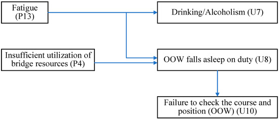 Community 5 includes 5 nodes of fatigue (P13), insufficient utilization of bridge resources (P4), failure to check the course and position (OOW) (U10), drinking/alcoholism (U7), and OOW falls asleep on duty (U8). The community has typical ground accident characteristics, as shown in Figure 15. Seafarers are in a fatigued state and there may be alcoholism or drinking within 4 h before the watch (operation), and the alarm system such as BNWAS (Bridge Navigational Watch & Alarm System) is not fully utilized during the watch on the bridge, resulting in the OOW falling asleep on the bridge, thus, not checking the course and position as required, which eventually lead to the ship grounding accidents.