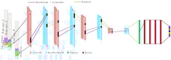 CNN architectures come in various dimensions, including 1D, 2D, and 3D formats. Among these, 2D CNNs are most prevalent and are commonly employed for tasks such as image classification, similarity clustering, and object recognition in scenes. The rationale behind the prevalent use of 2D CNNs in image classification stems from the inherently two-dimensional nature of image data []. Conversely, Conv1D architectures are typically applied for analyzing time series data. Given that the vibration data obtained from building structures also exhibit temporal characteristics, Conv1D architectures can be effectively utilized for the classification of acceleration data [].