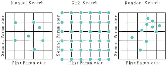 The advent of deep learning introduced complex architectural structures with multiple layers, each governed by a set of hyperparameters determined by the designer. While some hyperparameters, such as optimization algorithms and activation functions, involve straightforward selection from a limited pool of options, others, including the number of layers and neurons, learning rates, and kernel sizes, require meticulous consideration due to their broad range of potential values. Choosing the appropriate hyperparameter values is often an iterative process, as the initial selections may not yield optimal results. Designers typically adjust these parameters iteratively, observing the model’s performance with each change to identify the most suitable hyperparameter combination. Additionally, automated methods exist to streamline this selection process. Two common hyperparameter tuning techniques are random search and grid search. In random search, values are randomly selected from predetermined ranges for each hyperparameter, with iterations continuing until the best-performing combination is found. On the other hand, grid search evaluates all possible combinations within specified ranges to identify the optimal hyperparameter group. The concept of random search for hyperparameter optimization was initially proposed by Bengio et al. []. Similar to grid search, this approach involves predetermining the hyperparameter ranges based on prior knowledge of the problem. However, instead of testing every value within these ranges, random values are selected and evaluated until the best-performing hyperparameter group is discovered or a desired performance level is achieved []. In addition to the techniques mentioned, Figure 3 illustrates a comparison of search algorithms, where the axes represent different hyperparameters. Each dot corresponds to a specific combination of hyperparameters evaluated by each method. In this visual representation, the different exploration strategies employed by each method can be observed, as well as how the hyperparameter space is navigated by them.
