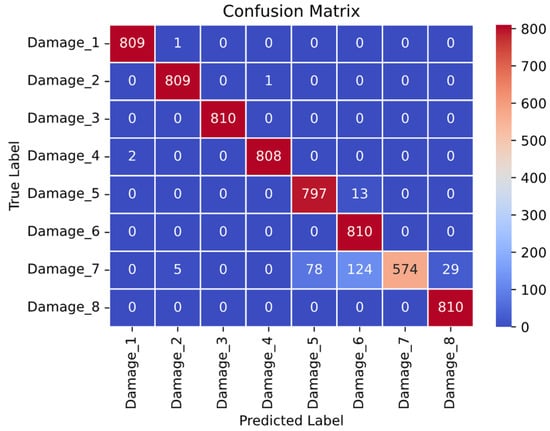 In order to gauge the performance of the optimized model, it was subjected to evaluation using the test data. The confusion matrix, depicted in Figure 6, and the corresponding classification report in Table 4 provide insights into the model’s predictive capabilities. While the optimized model demonstrated high accuracy in predicting most damage cases, it exhibited some confusion, particularly with damage_7 classification. This poor performance for damage_7 might be attributed to various factors such as imbalanced data distribution, insufficient representation of damage_7 instances in the training dataset, or the presence of unique features in damage_7 cases that were not effectively captured by the model. Despite achieving F1 scores exceeding 90% for other damage categories, the F1 score for damage_7 stood at 86%, indicating relatively poorer performance in predicting instances of this specific damage type. However, it is worth noting that the overall accuracy for the test data remained commendable at 97%, surpassing acceptable levels.