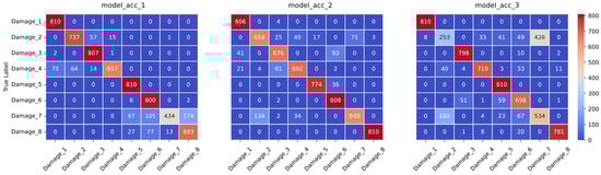 It was stated there were a total of four accelerometers in every story and at the ground level. Hyperparameter optimization was also conducted for the neural network by using the data of the accelerometers on each floor separately, except for the ground acceleration data. The accuracy of the neural network on the test set was 89, 90, and 83% for acc1, acc2, and acc3, respectively. Even though the neural network was expected to perform worse with less data, the results for training of the neural network on single-accelerometer data were fairly satisfying. The confusion matrix and the classification report for all neural networks trained on the single-accelerometer data are presented in Figure 7 and Table 5, respectively. Overall, the performance of the neural network dropped mildly. This was the expected result. However, given that the network was working with four times less data, the model was trained and tested far faster. This is an advantage because of the computing power. All data handling, training, and testing of the data were carried out on an AMD 3600X processor and RTX2070 GPU. While the hyperparameter optimization for single accelerometers took roughly 2 h for each, it took approximately 7 h for the whole dataset. This ratio is also valid for testing cases. All hyperparameter optimization results are given in the tables in Appendix B. A receiver operating characteristic (ROC) curve is a graphical plot that illustrates the performance of a binary classifier system as its discrimination threshold varies. It is created by plotting the true positive rate (TPR) against the false positive rate (FPR) at various threshold settings. The area under the curve (AUC) is a measure of the overall performance of the classifier, where a larger area under the curve represents better performance. ROC-AUC curves are a helpful tool for determining the accuracy of a binary classifier system. They can be used to compare different models, allowing for a better understanding of the performance of each model. Additionally, the AUC metric can be used to measure the overall performance of a model and help identify when a model is over- or underfitted. The ROC-AUC curves for all model are given in Appendix C.