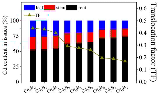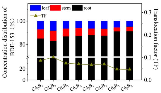 In the present study, BDE-153 and Cd were not detected in the roots, stems, or leaves of the plants in the control group (Cd0B0). After eight days of the hydroponic exposure experiment, the content of pollutants in the plants after harvest was analysed to understand the uptake and transport of various pollutants into the plants. Amaranth is divided into three parts—root, stem, and leaf—to determine the content of pollutants in order to more accurately grasp the absorption and transfer of Cd and BDE-153 in amaranth.