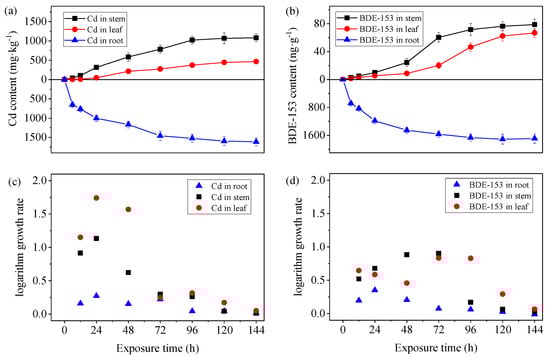 Changes in Cd and BDE–153 concentrations in amaranth roots, stems, and leaves over time under combined pollution conditions. (a,b) represent the concentration changes in Cd and BDE–153 in amaranth, respectively. (c,d) represent the logarithmic growth rates of Cd and BDE–153 in amaranth, respectively.