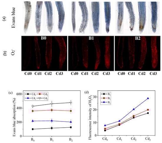 Plasma membrane integrity of amaranth root tips under different treatments (a), ·O2– fluorescence localisation staining (b), Evans blue absorption (c), and fluorescence intensity (d). (Cd0–Cd3 represent Cd concentrations of 0, 0.1, 1, and 5 mg/L, respectively. B0–B2 represent BDE–153 concentrations of 0, 5, and 20 μg/L, respectively).
