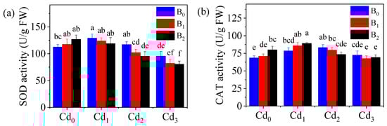 Effects of different treatments on SOD activity (a) and CAT activity (b) of root tip. (Cd0–Cd3 represent Cd concentrations of 0, 0.1, 1, and 5 mg/L, respectively. B0–B2 represent BDE-153 concentrations of 0, 5, and 20 μg/L, respectively). Different letters represent significant differences in data at the p < 0.05 level (LSD’s test).
