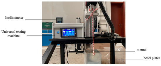 The experimental method employed in this study involved the use of a steel plate lift, as illustrated in Figure 2. During the experiment, the steel plate was initially wedged against one side of a cube. Subsequently, soil was poured into the cubic chamber until the latter was completely filled. A universal testing machine was utilized to lift the steel plate upwards at a speed of 0.03 m/s, resulting in the formation of a particle pile, as depicted in Figure 3. Finally, a tilt angle gauge was employed to measure the angle of soil accumulation. The physical experiments for the angle of repose were repeated 10 times, and the average value taken, ultimately yielding an actual soil pile angle of 35.55°.
