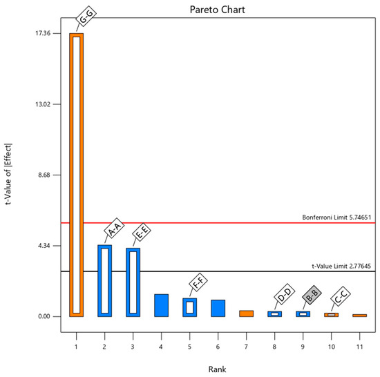 The Design-Expert 13.0 software was used to conduct a significance analysis of the results, leading to the determination of the significance of each simulation parameter, as shown in Table 5. The JKR surface energy coefficient (G) of the soil had a p-value of less than 0.01, signifying an extremely significant impact on the simulated pile angle. The restitution coefficient among soil particles (A) and the static friction coefficient between soil and steel (E) had p-values lower than 0.05, indicating a significant influence on the simulated pile angle. For the remaining simulation parameters, with p-values greater than 0.05, their impact on the simulated pile angle was minimal. As indicated by the Pareto chart in Figure 4, the soil JKR surface energy (G) coefficient exceeds the Bonferroni limit, exerting a highly significant influence on the heap angle. Moreover, both the soil–soil restitution coefficient (A) and the soil–steel static friction coefficient (E) surpass the t-value limit, indicating a significant impact on the heap angle. The analysis revealed that the insignificant impact of the rolling friction coefficient on the heap angle was attributable to the shape of soil particles. Soil particles are non-spherical, and the impact of the soil–steel static friction coefficient on the heap angle was more significant than that of the rolling friction coefficient. The insignificant influence of the soil–soil static friction coefficient was due to the establishment of four soil particle models (single spherical particle, double spherical particle, triple spherical particle, and quadruple spherical particle). The soil–steel restitution coefficient had no significant impact because there was no evident elastic collision between them during the experiment.