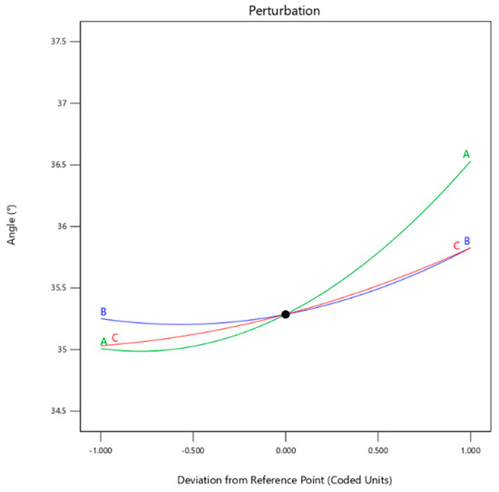 By plotting perturbation diagrams based on the existing quadratic polynomial model, as shown in Figure 5, it can be observed that, with the increase in levels of B:A and C:E, there is a gradual increase in the heap angle. The relationship between A:G and the heap angle exhibits a trend of slow increase followed by rapid increase.