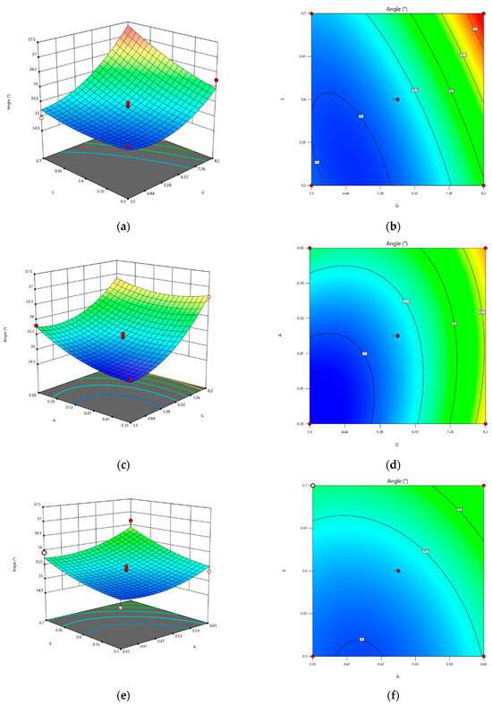 Table 8 reveals that, when considering pairwise interactions among the three significant factors, the influence on the heap angle decreases in the following order: GE, GA, and then AE. A detailed analysis of the interaction response surfaces is presented in Figure 6a,c,e. From Figure 6a, it can be observed that, when the soil–steel static friction coefficient (E) remains constant, the heap angle initially decreases and then increases with an increase in the soil JKR surface energy (G), and this change trend is very apparent. When the soil JKR surface energy (G) remains constant, the heap angle also initially decreases and then increases with an increase in the soil–steel static friction coefficient (E), albeit with a slightly diminished change trend compared to the variation in soil JKR surface energy (G). From Figure 6c,e, it can be observed that when one factor remains constant at a certain level, the other factor exhibits a slow increasing trend.