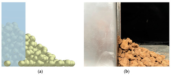 To verify the reliability of this parameter set, three sets of simulation experiments were conducted using the aforementioned combination as simulation parameters. The average simulated pile angle was determined to be 35.91°, with a relative error of only 0.01% compared to the measured value. This indicates that the parameter set exhibits high accuracy and reliability. The comparison between simulation and physical experiments is illustrated in Figure 7.