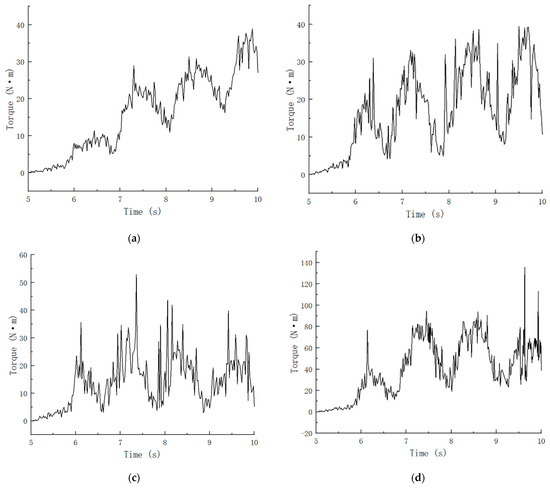 The torque change of the drilling shaft under different speed. (a) 100 r·min−1, (b) 200 r·min−1, (c) 300 r·min−1, (d) 400 r·min−1.