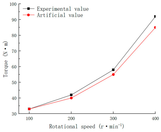 As indicated in Table 12, both factors have a highly significant impact on power consumption, and the interaction effect is also considerable. Based on the above analysis, it is concluded that the power consumption is optimal when the rotational speed is 100 r·min−1 and the feed rate is 0.05 m/s. Considering M = 30 N·m and n = 100 r·min−1, these values are substituted into the formula:
