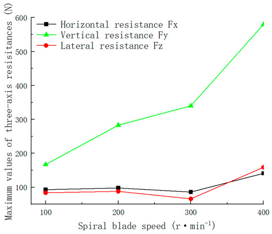 The change of the maximum triaxial resistance with the rotation speed of the spiral blade.