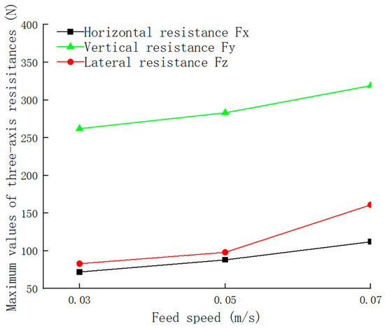 With a fixed tillage depth of 80 mm, a rotational speed of 200 r·min−1, and feed rates of 0.03 m/s, 0.05 m/s, and 0.07 m/s, three sets of simulation experiments were conducted. The variation in the maximum three-dimensional resistances experienced by the spiral blades with respect to the feed rate is depicted in Figure 15. Vertical resistance is the primary factor influencing drilling power consumption, and the maximum lateral resistance is slightly greater than the maximum parallel resistance. As the feed rate increases, the maximum resistances in all three directions also increase. When the feed rate exceeds 0.05 m/s, the maximum lateral resistance sharply increases, while the growth rates of the maximum vertical and horizontal resistances remain relatively constant. Soil trench experiments indicate that the torque on the spiral blades increases with faster feed rates, albeit at a relatively moderate rate.