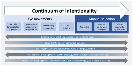 Comparing tasks. Despite the striking diversity of tasks used in previous studies, their impacts on human–CNN similarity have not been systematically investigated. A few studies assessed the impacts of task characteristics on human attention but did not relate these results to CNN attention. First, Yang et al. [] compared two eye tracking procedures: free viewing versus explaining why an image matches its label. Free viewing led to distributed eye movements that often targeted irrelevant objects, while explanation induced a focus on key features. Second, Das et al. [] used manual deblurring and varied the information available to participants (e.g., full image, model prediction). A medium amount of information produced attention maps that could most easily be interpreted by new participants. No previous studies have assessed how task variations affect the similarity between humans and CNN; thus, we can only speculate about that. Figure 1 presents a continuum of intentionality on which different elicitation tasks can be placed. Eye movement tasks are located at the low intentionality end of the continuum whereas manual selection tasks are located at the high end. Presumably, tasks at the low end reflect attentional processes more directly but also produce more false positive information. Conversely, tasks at the high end can specify the category as imagined by humans but also produce false negatives and redundant information.