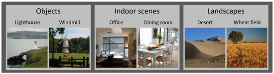 For the image type objects, all scenes included one clearly discernible object of the respective category (i.e., lighthouse, windmill) and thus categories were unambiguously defined by local object information. While the objects were embedded in natural contexts, these contexts could be more or less informative. For instance, only some of our lighthouses were presented in front of a coastline. Some images also contained other, irrelevant objects (e.g., ships or cars). For indoor scenes, the images presented an arrangement of objects in a room with a specific function (i.e., office, dining room). All images included chairs and tables and three offices also included a person. For landscapes, nature scenes with large, relatively uniform areas were used (i.e., desert, wheat field). Some landscapes also contained salient objects (e.g., agricultural machinery, houses).