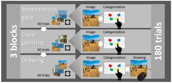 A session started with participants receiving a brief summary of the procedure and providing informed consent. They were then shown the instruction video and the eye tracker was calibrated. This was followed by two practice blocks (42 trials each), in which participants learned the key mapping and received feedback on the correctness of their responses. During the first practice block, they had to categorize words that corresponded to one of the six categories and, in the second practice block, they had to categorize images. They also received feedback about their response and, in case of an error, they were reminded of the correct key assignment. An overview of the main experiment’s procedure is provided in Figure 3. It consisted of three blocks (60 trials each, corresponding to the 60 images presented in random order). The blocks corresponded to the three tasks and always appeared in the same order. In the first block (i.e., spontaneous gaze), participants merely had to categorize the image by pressing a key. In the second block (i.e., gaze-pointing), participants had to categorize the image as well but were asked to intentionally look at those areas of the image that were most relevant for their decision. In the third block (i.e., drawing), participants had to first categorize the image again and, after their keypress, they had to draw a polygon around the relevant area with their mouse. Each mouse click defined a polygon point and, after setting the last point, participants could connect the last point to the first one by pressing the lower left key of the Cedrus pad.