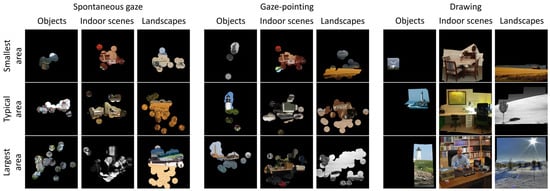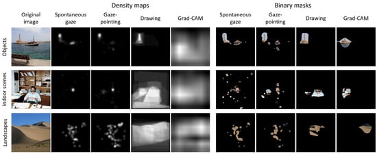 Manual selection. Compared to eye tracking studies, the number of studies that elicited human attention maps via manual selection is smaller [,,,,,]. At the same time, their diversity is even larger. Manual selection studies differ in how people defined the areas relevant for categorization and in their degrees of freedom. One type of task is to define the outlines of relevant areas, either by drawing polygons [] or by lassoing them []. Such procedures provide a binary value (0/1) for each participant and image and gradual variations in attention maps only emerge from the aggregation of several participants. Conversely, another method immediately provides gradual relevance estimates for each participant []: participants viewed blurred images and had to deblur relevant areas by repetitive rubbing with their mouse cursor. This enabled a slight deblurring of areas that were only coarsely searched and a complete deblurring of areas that, upon closer inspection, turned out to be actually relevant. For one, this procedure provides a close analogy to eye movements, which also combine a quick ambient “where” processing of the layout and a subsequent focal “what” analysis of object details []. Finally, one study elicited human attention maps by asking participants to order predefined image segments according to their relevance for classification []. Another version of the same principle is to click on relevant image areas with the mouse to make them visible for a partner [].