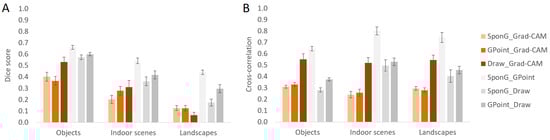 We used two metrics to compute the similarity between attention maps: the Dice score and cross-correlation. The Dice score [] was used for binary masks and specifies the overlapping area relative to the total attended area. It is calculated by taking two times the area highlighted in both maps to be compared (intersection) and dividing it by the sum of the two individual areas. If the areas have the same size (as it is the case in the present study), the Dice score simplifies to the size of the intersection divided by our chosen area size of 5%. This procedure creates values between 0 and 1, with 0 indicating no overlap and 1 indicating complete overlap. This metric has already been used in previous studies to compare human and CNN attention [,]. It is not only easy to compute but also easy to interpret because the numerical value directly corresponds to the share of overlapping area. As all maps are reduced to the same size, it also allows for a straightforward comparison of the overlap in different conditions (e.g., tasks or image types), even when the total attended areas systematically differ between them. However, this simplicity can be considered a limitation as well because comparing binary masks eliminates the rich information available in gradual density maps. Therefore, we additionally compared the gradual maps using cross-correlation (Pearson), which has been deemed one of the most suitable metrics for purposes similar to ours []. Pearson’s correlation coefficient treats two given density maps as variables and describes their linear correlation. We calculated the value for two density maps as proposed by Bylinskii et al. [] by dividing the covariance matrix for both maps by the product of the covariance of each map itself.