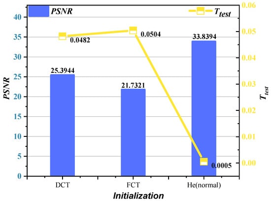 Firstly, we explore the initialization method of network redundancy analysis operator Φ and select three initialization methods, namely, discrete cosine transform (DCT dictionary), Fourier transform (FCT dictionary), and the He (normal) method for the experiment. Figure 5 shows the restructuring effect of the three initialization methods. It can be seen that the restructuring Ttest obtained by using the He (normal) initialization method is the minimum, and the restructuring PSNR performance of the He (normal) method is significantly better than the other two methods. This indicates that when the He (normal) method is chosen to initialize Φ, the noise level of the reconstructed signal is relatively reduced and closer to the original signal.