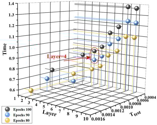 The reconstruction accuracy is the primary index to judge the performance of the reconstruction algorithm, and then the reconstruction speed shall be considered. The experiment explores the relationship between the number of network expansion layers, signal reconstruction Ttest, and network convergence time, and the results are shown in Figure 6. Using three different color balls to represent the results of network iterations 80, 90, and 100, respectively, it can be observed that when the number of unfolding layers is 4 or more, the reconstruction Ttest is the lowest and gradually converges, indicating that the setting of four layers is more effective in achieving higher reconstruction accuracy. The same results are obtained with both 90 and 100 iterations when the number of layers is 4, but 90 iterations take less time. Experimentally setting the empirical network training parameters to 4 layers and 90 iterations is a better compromise scheme, as required by the actual situation.