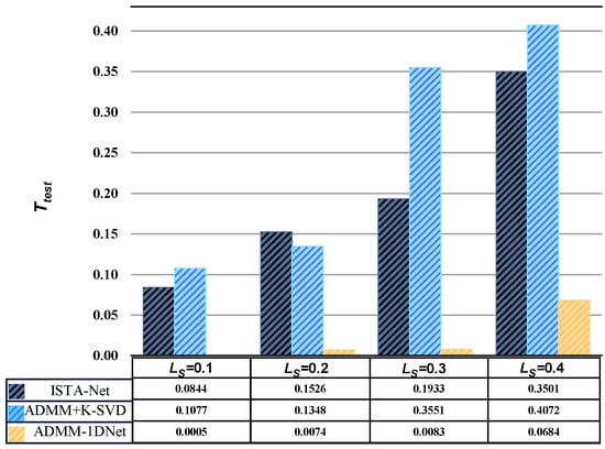 Figure 7 shows the relationship between LS and Ttest, and it can be observed that as the signal LS increases, the Ttest of the reconstructed signal of the three algorithms increases. It is noted that the reconstruction Ttest of ADMM-1DNet at signal sparse levels of 0.2 and 0.3 is much lower than that of the other two algorithms, and the results remain relatively stable. This demonstrates that the ADMM-1DNet implementation scheme still has good robustness when processing signals with different sparse levels and can adapt to the task requirements of signal reconstruction with different sparse levels.