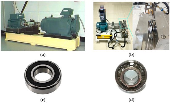 The test bench and the failure bearings: (a) CWRU bearing test rig; (b) XJTU-SY bearing test rig; (c) 6205-2RS JEM SKF; (d) LDK UER204 [64,65].