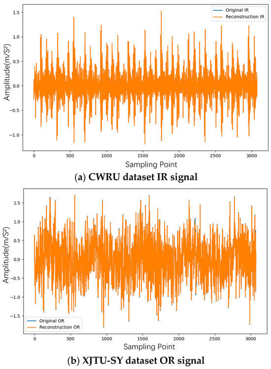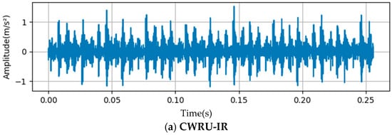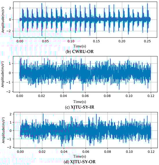 Two authoritative bearing experimental data sets are used in the experiment: the bearing experimental data set (CWRU) [64], published by CASE Western Reserve University, and the bearing experimental data set (XJTU-SY) [65], published by Xi’an Jiaotong University. Figure 8 shows the test rigs and the bearings used for the two datasets. The CWRU vibration data was collected using accelerometers, which were attached to the housing with magnetic bases. Accelerometers were placed at the 12 o’clock position at both the drive end and fan end of the motor housing. Four types of bearing data at the drive end were selected as sample signals in the dataset with a signal frequency of 12 kHz, a motor load of 1 HP, and a fault diameter of 0.007″. In the XJTU-SY, two accelerometers of type PCB 352C33 are positioned at 90° on the housing of the tested bearings, i.e., one is mounted on the horizontal axis and the other is mounted on the vertical axis. In the dataset, the horizontal outer ring fault signal is selected as the sampling signal at 40 Hz, the signal sampling frequency is 25.6 kHz, and a total of 32,768 data points are recorded in each sampling, i.e., 1.28 s, with a sampling period of 1 min. In order to fully simulate the outdoor working environment of mechanical equipment, Gaussian white noise with an SNR of 30 dB is added to all signals.