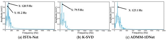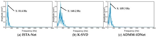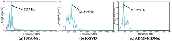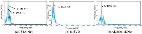 Following the network parameter setting guidelines specified in Section 4.2.1, in the real bearing vibration signal, the reconstruction performance of the ISTA-Net network proposed in literature [48] and the ADMM + K-SVD-based CS method in literature [35] are compared with the ADMM-1DNet network algorithm proposed in this paper. To ensure the fairness of the algorithm reconstruction experiment, the parameters of the CS method based on ADMM + K-SVD are also optimized by the embedded program. The whole reconstruction process is described in Section 2.3.
