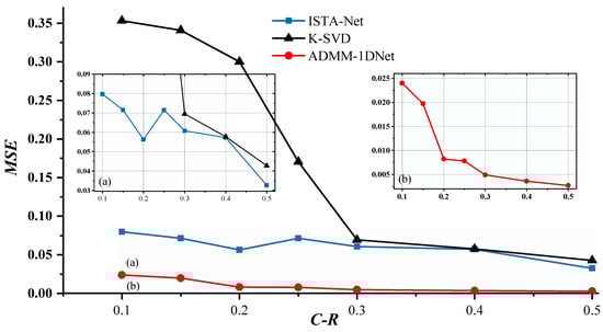 Signal reconstruction experiments were conducted by feeding the same compressed measurement signal y into the trained ISTA-Net, ADMM-1DNet, and ADMM + K-SVD algorithm methods. (For fairness, all reconstruction methods operate independently on the same computer by comparing the evaluation indexes in Section 4.1).