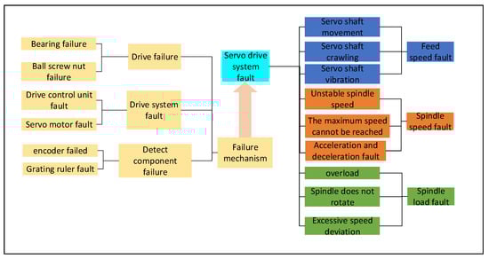 To determine and eliminate the system fault timely and accurately, a comprehensive overview of the common fault types of the existing servo drive system is made, and its fault mechanism is deeply analyzed, as shown in Figure 4. The types of fault that occur in the servo system can include the servo shaft moving, the spindle speed becoming unstable, being unable to reach the highest speed, acceleration and deceleration failure, speed deviation being too large, etc. Some of the reasons for these failures are analyzed as follows: