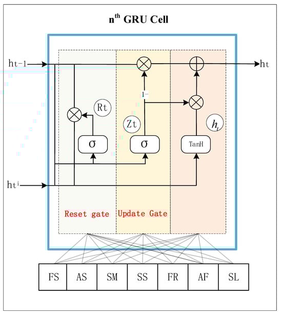 The GRU is a variant of the RNN that uses gating mechanisms to better capture and remember long-term dependencies in sequence data [42]. There are some similarities between the GRU and the LSTM in that both have gating mechanisms that control the flow of information and the updating of memories. The main difference between them is the internal structure and the number of gating mechanisms. The GRU simplifies the structure of the LSTM and consists of only two gated units: update gate and reset gate. The update gate controls whether the memory unit from the previous moment is passed to the current moment, while the reset gate controls how the input from the current moment is combined with the memory unit from the previous moment. Because of their simpler structure and fewer parameters, GRUs can train models faster and have better computational efficiency than LSTM in some cases.