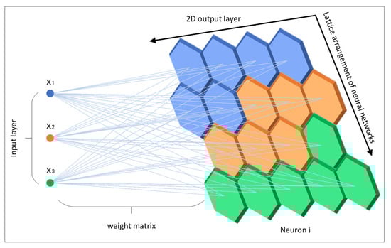 SOM consists of a grid map and a low-dimensional matrix, with each node considered to be a neuron. The neurons in the network each have a weight vector the same size as any input data point. This matrix is used to evaluate the distance of any input vector from each cell weight in the data set. In the initialization phase, the weights of each cell are randomly assigned, and then the data points find the closest neuron and are assigned to the nearest neuron. The neuron with the smallest distance can be called the best matched unit (BMU). The weight of the BMU is then updated as neurons move towards the data point. During the same iteration, the weights of neurons adjacent to the BMU are also updated so that they move in the same direction as the displaced BMU, but at a lower rate. As more iterations are made during the training process, the amount of change in the neuron weights decreases as the grid map gradually approaches the input data points with each iteration. All data points in the training process are ongoing. After the network training is complete, each data point is assigned to a cell of the grid map. Inputs with similar data characteristics are grouped around adjacent cells, and SOM networks are often constructed as two-dimensional, regularly arranged lattice arrays of neurons, as shown in Figure 7.