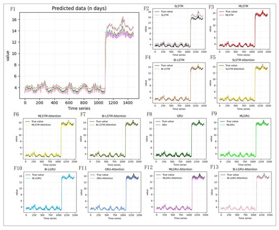 (F1) Summary of prediction results. Prediction results with (F2) SLLSTM, (F3) MLLSTM, (F4) Bi-LSTM, (F5) SLSTM-Attention, (F6) MLSTM-Attention, (F7) Bi-LSTM-Attention, (F8) GRU, (F9) MLGRU, (F10) Bi-LGRU, (F11) GRU-Attention, (F12) MLGRU-Attention, (F13) Bi-LGRU-Attention.
