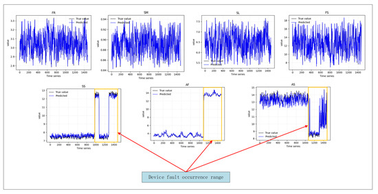 The selected model is used to predict the operating parameters of the machine tool, and the results are shown in Figure 18. According to the prediction results, the selected prediction model can accurately predict the output of the operating parameters of the machine tool and prepare for further fault diagnosis. At the same time, the prediction model derived from a single data item can still have a good prediction effect when processing the other six data items, which further explains the excellent generalization ability of the MLGRU-Attention prediction model.