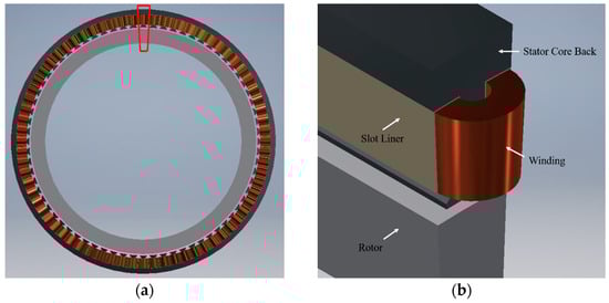 (a) Demonstration of the active part of the PM machine. (b) An extracted unit used in the simulation, including the stator core back, end winding, slot liner, and rotor. Red solid lines in (a) highlight the unit extracted from the entirety of the active area for focused simulation analysis.