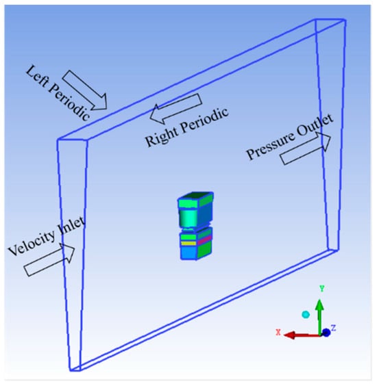 CFD simulations emerge as a vital complementary technique to traditional thermal experimental testing, offering significant advantages in terms of cost and time efficiency for thermal management strategies. The computational domain for these simulations is illustrated in Figure 3. To accurately follow the true geometric conditions of the model while conserving computational resources, periodic boundary conditions are applied to the side planes of the domain. The model uses both fluid and solid meshes created in Ansys ICEM CFD, specifically designed to address the conjugate heat transfer problem. This includes a refined proximity mesh around the unit to particularly model heat dissipation. The mesh’s total size is approximately one million cells, a figure determined after verifying that the simulation results are mesh-independent. The defined computational domain employs a velocity inlet and a pressure outlet, facilitating the process of air-cooling simulations and allowing for a comprehensive analysis of thermal management within the system.