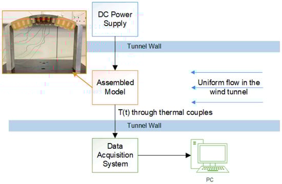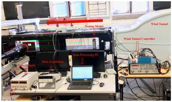 Our experimental investigation was performed within an open-return wind tunnel. The dimensions of the tunnel’s test section were specified as 350 mm in height, 450 mm in width, and 3000 mm in length. Depending on the Reynolds number, the turbulence intensity (TI) within this section ranged from 0.4% to 0.6%, and the airflow velocity could be adjusted up to 35 m/s. The setup of this experimental arrangement is detailed in Figure 5, utilising the generated data to corroborate the numerical simulations and to refine the model as needed. Through this calibration process, the model is enhanced for more accurate CFD analyses concerning the motor assembly.