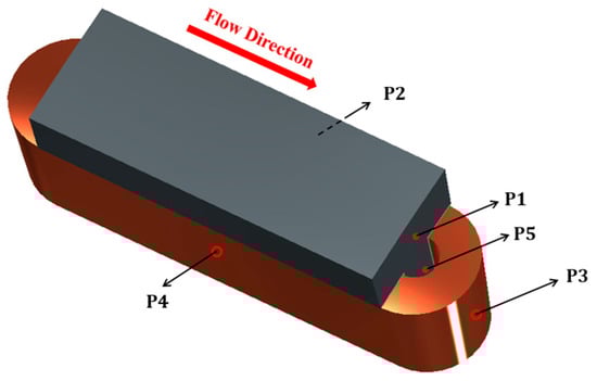 Five Type-K plug-in thermocouples were used in temperature monitoring within the experiment, strategically placed at five distinct locations to capture temperature variations accurately. These positions are illustrated in Figure 6, and ensured that all end-winding measurement sites were positioned on the downstream side to prevent any disturbance to airflow. Precision in the temperature measurements was optimised by situating all sensors at the central unit of each tooth and winding assembly. Additionally, ambient temperature readings were collected to establish temperature differentials across all five designated points. A prerequisite for data collection required the wind tunnel’s operation for a minimum duration of 60 min, ensuring the establishment of a steady-state condition prior to logging any measurements.