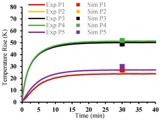 Upon conducting the experiments at an airflow speed of 10 m/s and a turbulence intensity of 0.5%, temperature increases across various locations were recorded, with findings detailed in Figure 7. In response to these empirical outcomes, simulation parameters were fine-tuned to align with the experimental conditions, facilitating a direct comparison between the simulated and actual temperature rises, as illustrated in the same Figure.
