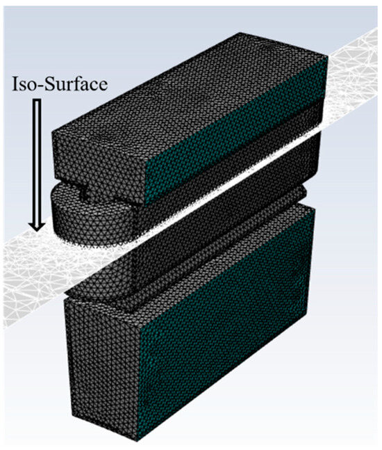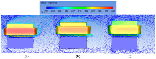 In this section, we discuss the subsequent numerical simulations that were conducted considering three distinct air velocities and two levels of turbulence intensity. The influence of varying the air channel within the windings on cooling effectiveness is examined. For this, a representative model of the rotor geometry, intended to simulate the air gap between the rotor and stator, was implemented into the simulations. Additionally, an Iso-Surface spanning the X–Z plane was generated to observe temperature fluctuations within the aggregated windings, as illustrated in Figure 8.