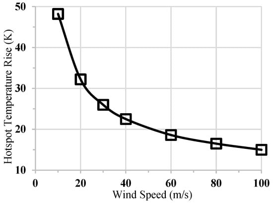 Air velocity plays a crucial role in the efficiency of air-cooling systems. In the conducted simulations, air speeds from 10 to 100 m/s were tested. The conditions for the ambient temperature and turbulence intensity were standardised at 288 K (15 °C) and 0.5%, respectively. The temperature variation of maximum temperature increments across the range of air speeds is presented in Figure 9. Generally, the increment in hotspot temperature relative to the ambient temperature decreased as the air speed increased. However, the rate of the temperature change relative to the air speed diminished at higher air velocities.