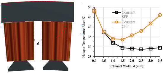 Alternatively, maintaining a constant CFF results in the coil retaining anisotropic thermal conductivities equivalent to those of the original winding, since the copper percentage remains unchanged. Here, convective heat transfer emerges as the primary differential in cooling performance. However, maintaining the same coil MMF necessitates an increase in the current density as the copper volume diminishes, leading to a rapid increase in energy loss density as the channel widens, which counteracts the benefits of the improved convective heat transfer. The optimal channel width identified in this case is 1.5 mm, yielding a 33.7 K temperature rise of the hotspot, marking a 30% and 10.4% improvement over the original design with and without slot liners, respectively. When the channel width extends beyond 1.5 mm, the temperature rises significantly due to the escalating loss density.